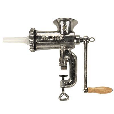 Now you can make meat loaf, sausage, ground beef, turkey stuffing, fruit cobblers, vegetable sauces and many other delicious ground foods the easy way! Old World style cast iron grinder is good-sized: 12in.H x 4in.W x 12in.L. Bright plated; disassembles for easy cleanup. Clamps to a table edge up to 1 1/2in. thick. Includes sausage stuffer attachments in 3 sizes. Grinds 1.65 pounds per minute. Power Supply: Hand, Capacity Per Hour (lbs.): 99, Size of Plate Holes (in.): 3/8, Overall Dimensions L x W x H (in.): 12 x 4 x 12